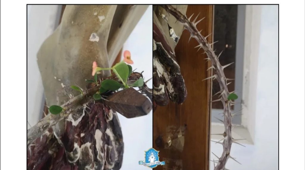 والمؤمنين عظيمة، حين شاهدوا أوراق صغيرة تنبت من الأغصان الجافة. لكنها تكررت منذ بضعة أيام وهذه المرة إضافة إلى الأوراق ظهرت براعم صغيرة حمراء سرعان ما أزهرت زهور وردية اللون عند أقدام المسيح، حيث المسمار الذي يسمره على الصليب.