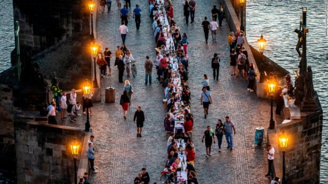 شارك آلاف التشيكيين في براغ بحفل عشاء جماعي على طاولة طولها 500 متر، احتفالا بتخفيف قيود الحجر الصحي إثر انتشار وباء كورونا.