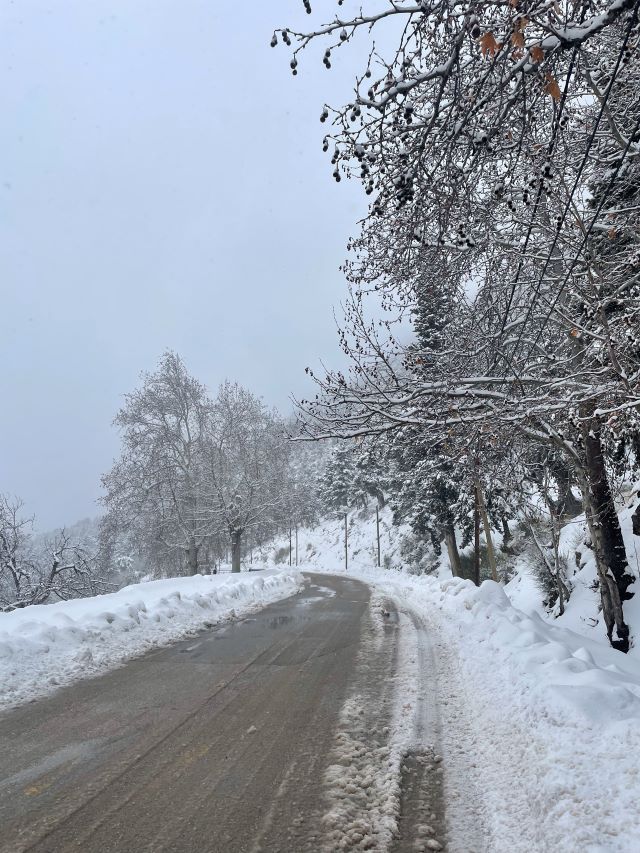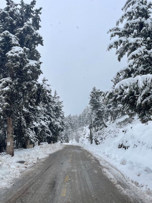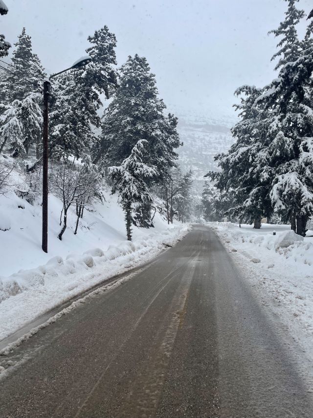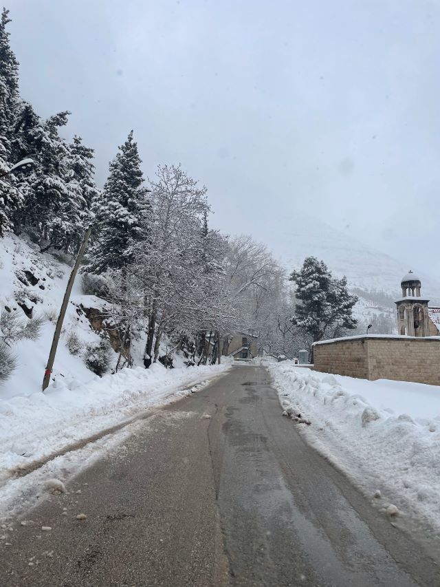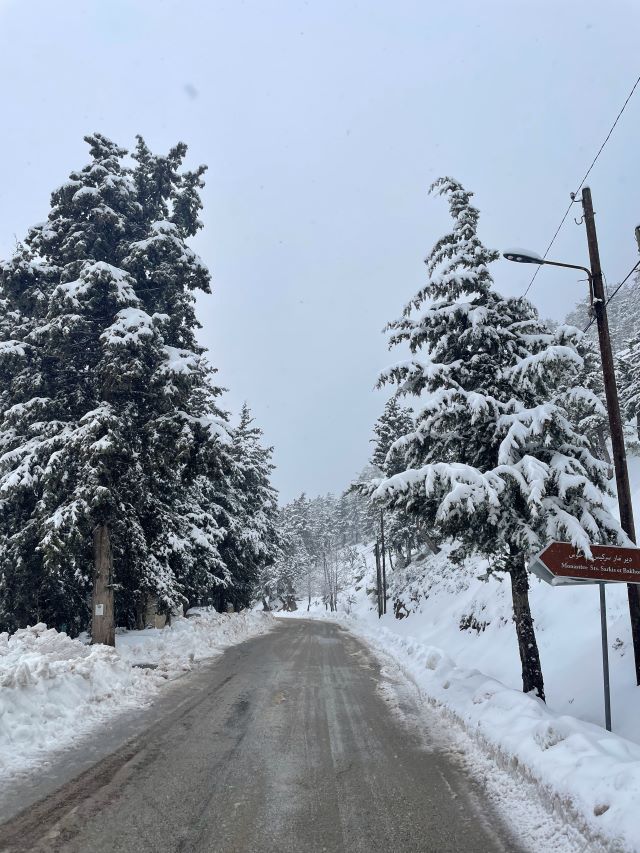 أما على طريق نبع دير مار سركيس وباخوس فيختلف المنظر مع انحناء الأشجار من ثقل الثلوج وسماع صوت تساقطه الذي يبعث فينا السكون والسعادة والراحة. وتعمل جرافات وزارة الأشغال العامة والنقل على فتح الطرقات ليلًا نهارًا تسهيلًا لحركة المرور. وتقوم شرطة بلدية زغرتا – اهدن بمساعدة السيارات التي علقت بسب كثافة الثلوج بالاضافة الى جهوزية الدفاع المدني في البلدة.