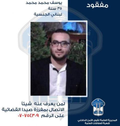لذلك، يرجى من الذين شاهدوه ولديهم أي معلومات عنه أو عن مكانه، الاتصال بمفرزة صيدا القضائية في وحدة الشّرطة القضائية، أو الاتّصال على الرقم: 754309-07، للإدلاء بما لديهم من معلومات.