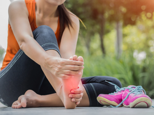 التهاب اللفافة الأخمصية: يحدث التهاب اللفافة الأخمصية عندما يؤدي الضغط الزائد على القدم إلى إتلاف رباط اللفافة الأخمصية، ما يسبب الألم والتصلب.