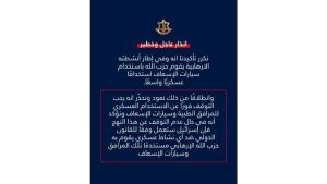 وقال أنه “في حال عدم التوقف عن هذا التصرف، ستعمل إسرائيل وفقًا للقانون الدولي ضد أي نشاط عسكري يُنفّذ باستخدام تلك المرافق”.