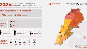 نشرت وزارة الصحة العامة التقرير اليومي الصادر عن مركز عمليات طوارئ الصحة حول تطورات العدوان الإسرائيلي على لبنان، وجاء فيه أن العدد الإجمالي للشهداء منذ 2 آذار حتى 28 آذار ارتفع إلى 1189، كما ارتفع عدد الجرحى الى 3427.