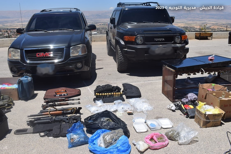 بتاريخ 27/ 6/ 2023، نفذت وحدة من الجيش في منطقة الشراونة – بعلبك عمليات دهم منازل مطلوبين بجرائم الخطف والسلب والإتجار بالمخدرات وإطلاق النار، وأوقفت المواطنَين (ج.ج.) و(ت.ج.) وضبطت سيارتين غير قانونيتين وعددًا من الأسلحة الحربية وكمية من الذخيرة والمخدرات.