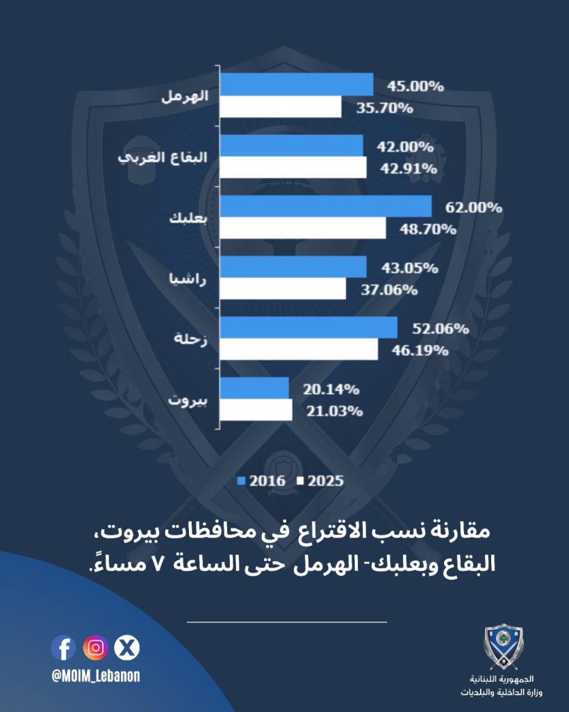 الداخلية وزعت نسب الاقتراع في محافظتي لبنان الجنوبي والنبطية مقارنة مع العام 2016