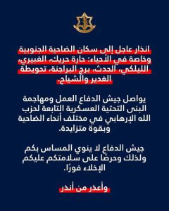انذار عاجل إلى سكان الضاحية الجنوبية وخاصة في الأحياء