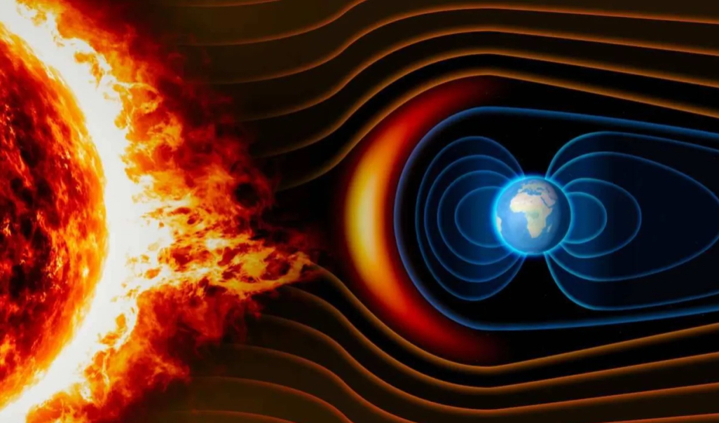 ويتولّد المجال المغناطيسي للأرض نتيجة لحركة الحديد المنصهر في نواة الكوكب؛ إذ يعمل درعاً واقيةً تحمي الغلاف الجوّي من الرياح الشمسية والجسيمات المشحونة الآتية من الفضاء.