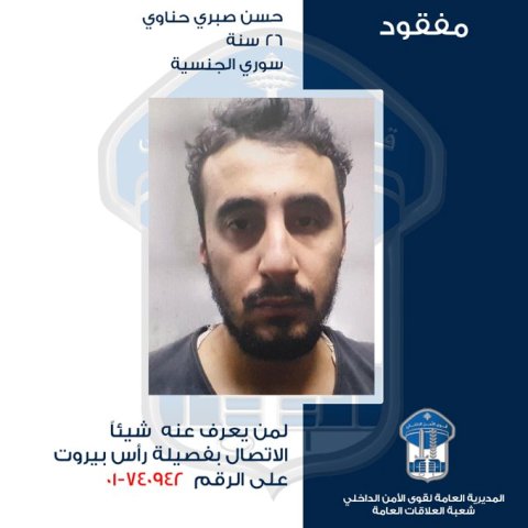تعمم المديرية العامة لقوى الأمن الداخلي، بناءً على إشارة القضاء المختص، صورة المفقود: