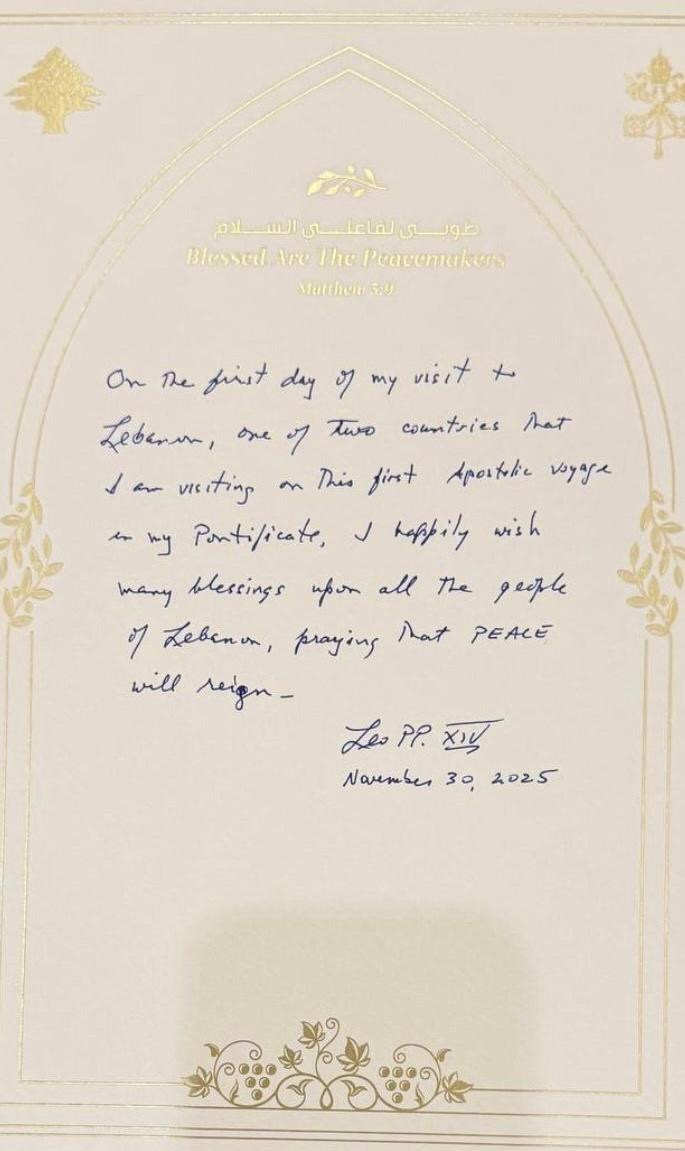 بالصورة… ماذا كتب البابا لاوون في سجل الشرف في قصر بعبدا؟