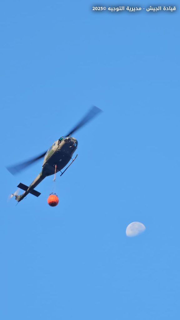 عملت طوافات من القوات الجوية في الجيش، بمشاركة وحدات عسكرية أخرى، على إخماد حرائق في بلدات: دبعل – الضنية، شدرا – عكار، البرجين وشحيم – الشوف، بالتعاون مع عناصر الدفاع المدني وجمعيات مدنية.