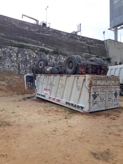 بالصور: إنقلاب شاحنة من على جسر حبوش ومصرع السائق
