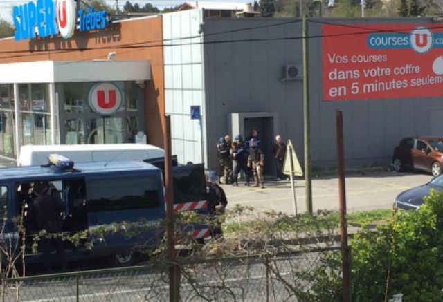 وأشارت المصادر نقلاً عن وزارة الداخلية الفرنسية في منطقة تريب، أن السلطات الفرنسية تقوم بعملية أمنية واسعة لإلقاء القبض على المسلح الذي يحتجز بعض الرهائن. وقالت مصادر إعلامية إن المسلح أعلن انتماءه لتنظيم “داعش”.