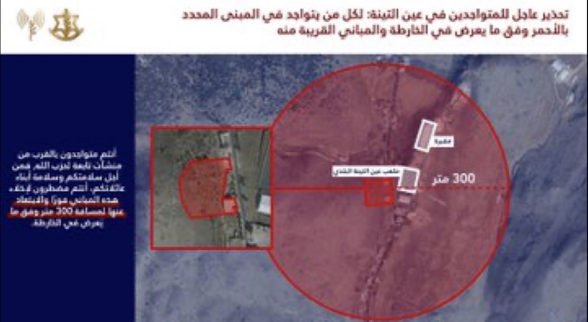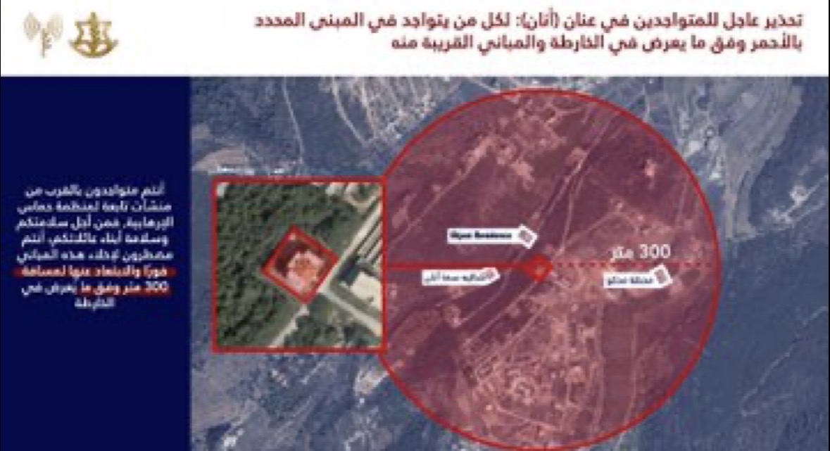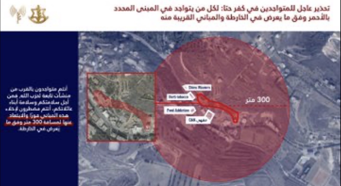 نحث سكان المباني المحددة بالأحمر في الخريطتيْن المرفقتيْن والمباني المجاورة لهما: أنتم تتواجدون بالقرب من مباني يستخدمها حزب الله ومن أجل سلامتكم أنتم مضطرون لإخلائها فورًا والابتعاد عنها لمسافة لا تقل عن 300 متر
