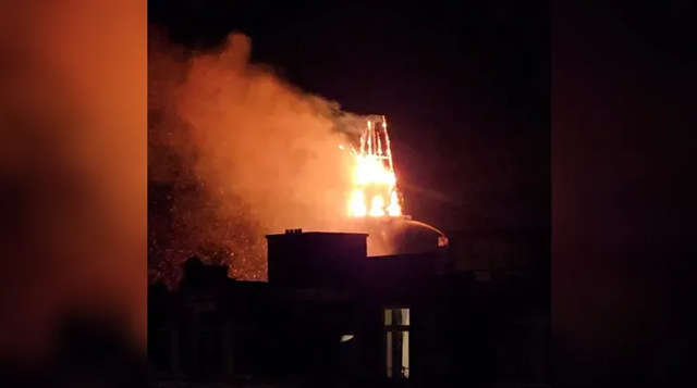 وبدأت النيران بعد منتصف الليل مباشرة، مما أدى إلى انهيار برج الكنيسة التي يعود تاريخ بنائها إلى عام 1872.