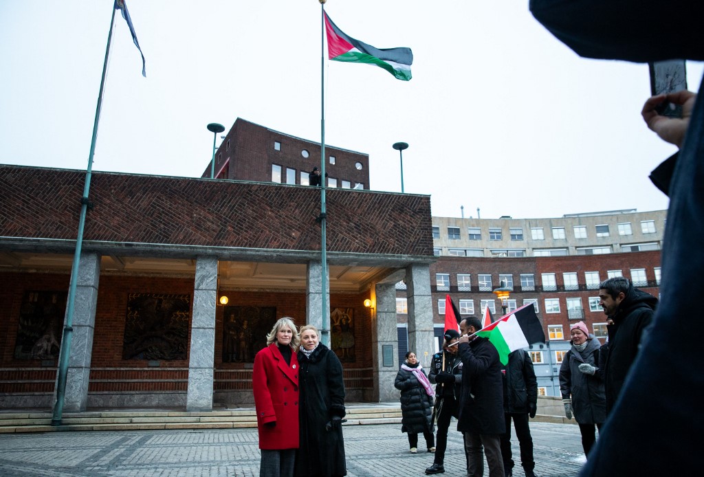 بلدية أوسلو ترفع العلم الفلسطيني أمام مقرها تضامناً مع غزة