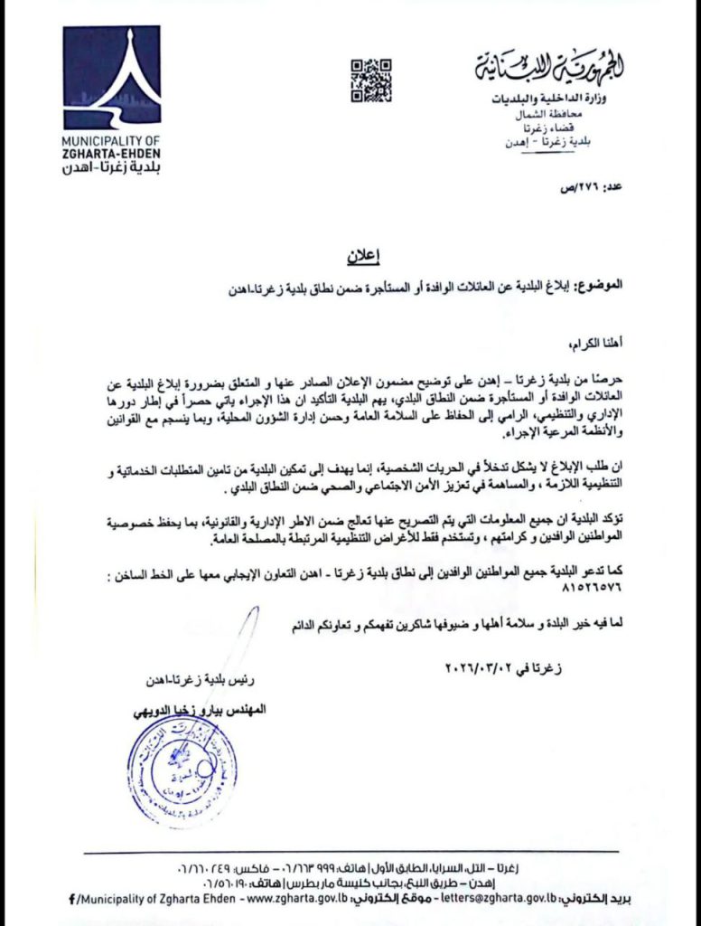 ابلاغ بلدية زغرتا – اهدن بالعائلات الوافدة أو المستأجرة له أسبابه التي نفندها في هذا البيان الصادر والذي نورد فيه كل النقاط .