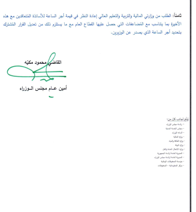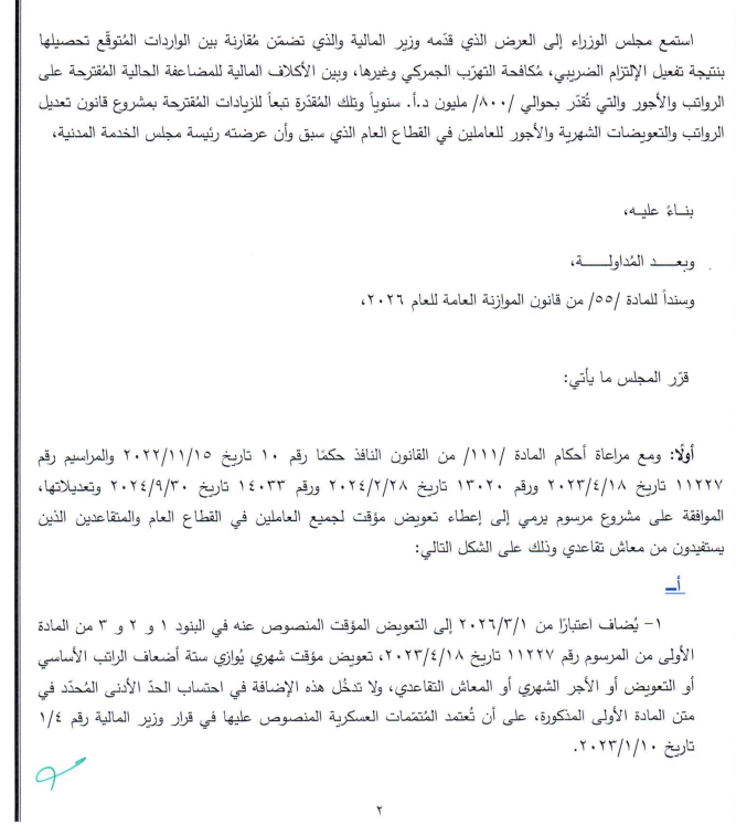 وطلب المجلس من وزارة المالية إعداد مشاريع القوانين اللازمة لفتح الاعتمادات وتغطية النفقات الناتجة عن هذه الزيادات، على أن يُستكمل إعداد مشروع قانون شامل لتصحيح الرواتب قبل نهاية آب المقبل.
