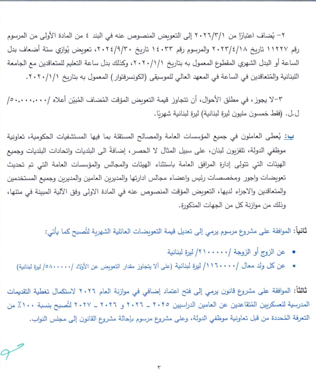 وبحسب القرار المصحّح، أقرّ مجلس الوزراء مضاعفة التعويض المؤقت للعاملين والمتقاعدين في القطاع العام ليوازي ستة أضعاف الراتب الأساسي، مع إضافة تعويض يوازي أربعة أضعاف بدل النقل، على أن لا يتجاوز مجموع التعويضات سقف 50 مليون ليرة شهريًا.