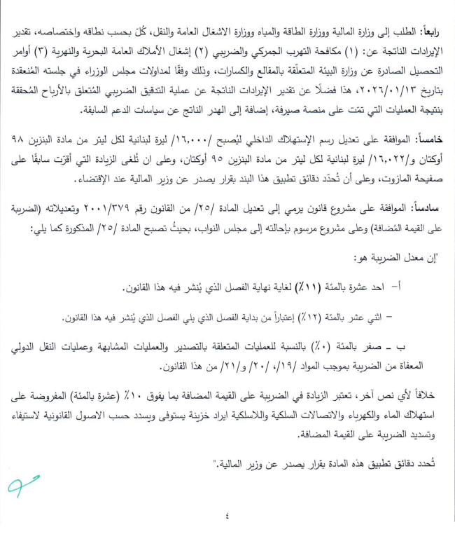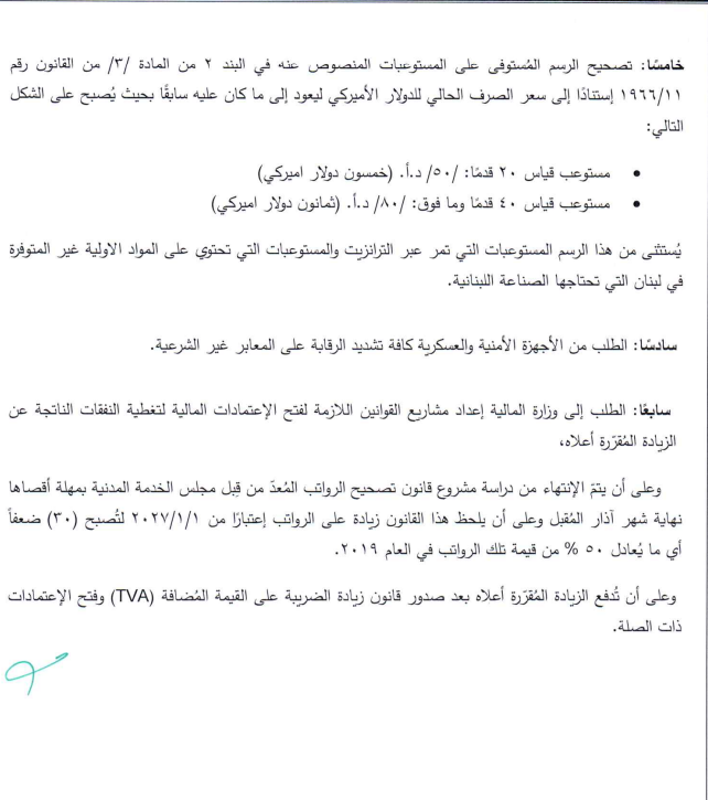 وتضمّن القرار أيضا تعديل رسم الاستهلاك الداخلي على البنزين، وزيادة تدريجية في الضريبة على القيمة المضافة لتصل إلى 12%، إضافة إلى تصحيح رسوم المستوعبات الجمركية وربطها بسعر الصرف الحالي.
