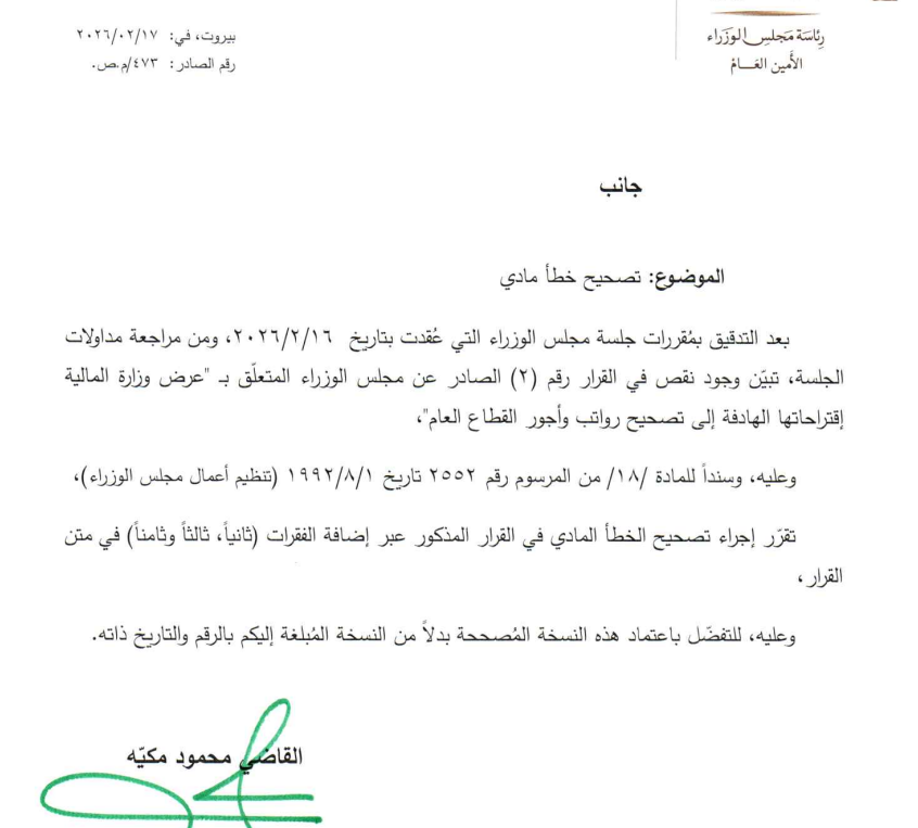 الوزراء اللبناني في كتاب صادر من رئاسة مجلس الوزراء – الأمانة العامة، أنّه “بعد التدقيق بمقررات جلسة مجلس الوزراء التي عُقدت بتاريخ 16/2/2026، تبيّن وجود نقص في القرار رقم (2) الصادر عن مجلس الوزراء المتعلق بعرض وزارة المالية اقتراحاتها الهادفة إلى تصحيح رواتب وأجور القطاع العام”.