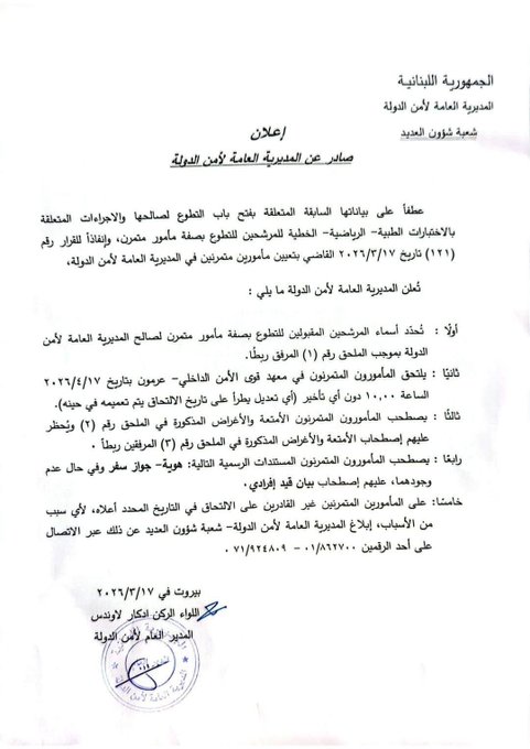 ‏كما تطلب من المرشّحين المقبولين الالتحاق بمعهد قوى الأمن الداخلي – عرمون بتاريخ 17/4/2026، واصطحاب الأمتعة والمستندات المحددة بالجدول.