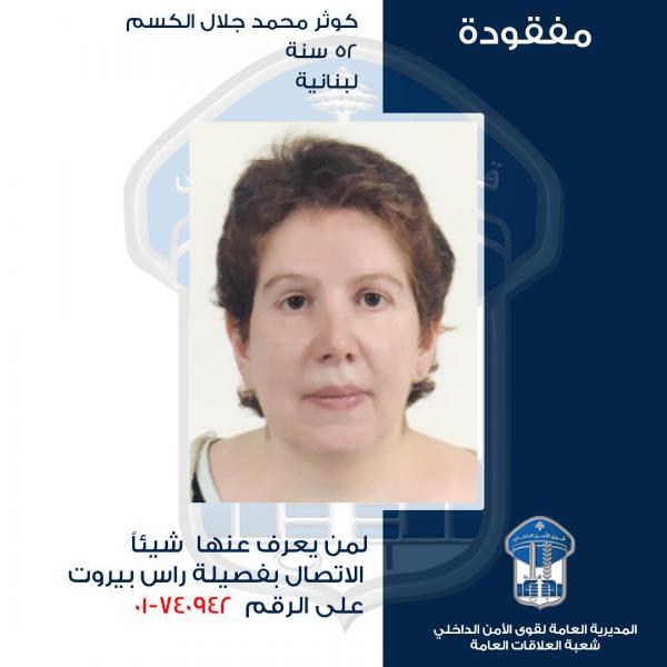 لذلك، يرجى من المواطنين الذين شاهدوها ولديهم أي معلومات عنها أو عن مكانها، الاتصال بفصيلة راس بيروت في وحدة شرطة بيروت على الرقم 740943-01، للإدلاء بما لديهم من معلومات.