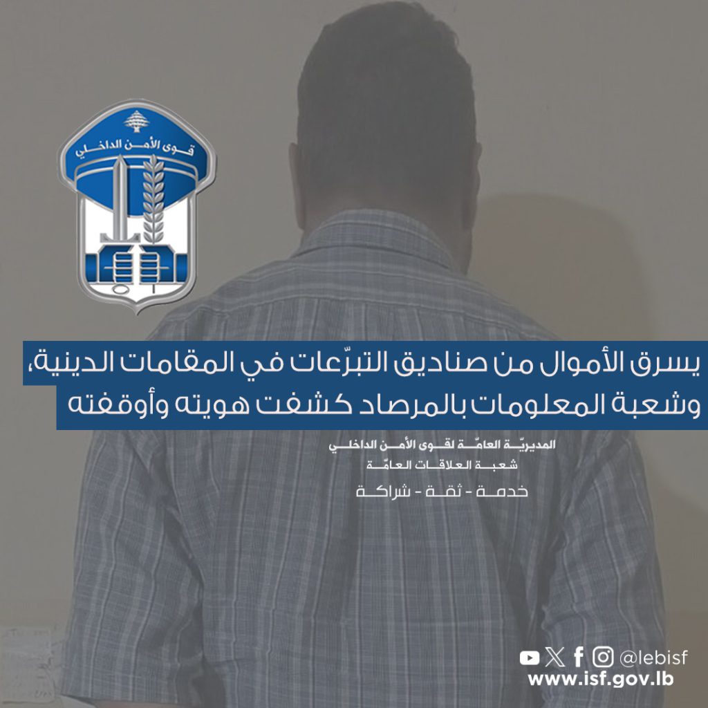 في إطار المتابعة اليوميّة التي تقوم بها قوى الأمن الدّاخلي بمختلف قطعاتها، للحدّ من عمليّات السّرقة في المناطق اللّبنانية كافّة، توافرت معطيات لدى شعبة المعلومات حول قيام شخص مجهول الهويّة بتنفيذ عمليّات سرقة أموال من داخل صناديق التّبرّعات والنذورات في عددٍ من المناطق
