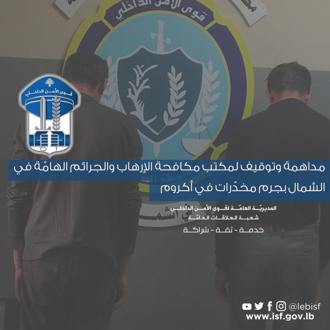 في سياق المتابعة المستمرّة التي تقوم بها قوى الأمن الداخلي لمكافحة عمليات تجارة المخدّرات وترويجها وملاحقة المتورّطين فيها، بتاريخ 12-12-2025، نفذت قوّة من مكتب مكافحة الإرهاب والجرائم الهامّة في الشمال التابع لوحدة الشرطة القضائية كمينًا محكمًا في أكروم الرويمه أسفر عن توقيف كلّ من:
