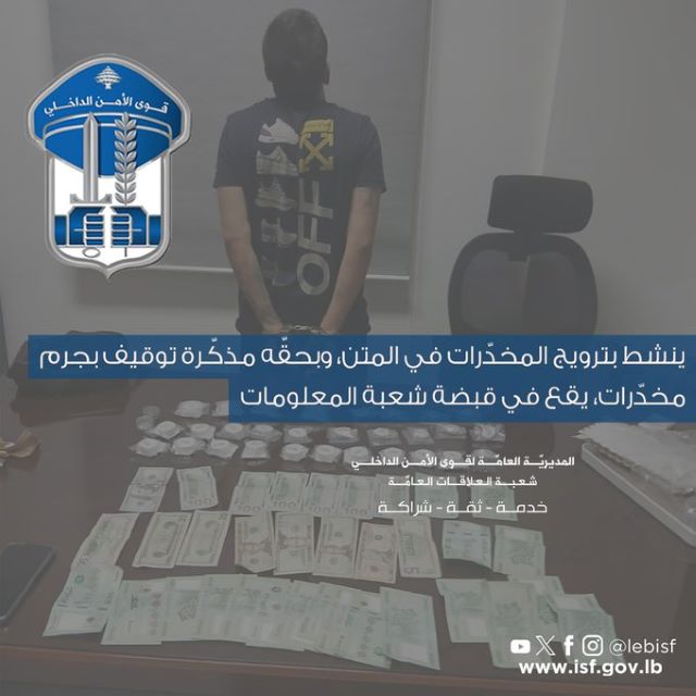 في إطار المتابعة المستمرّة التي تقوم بها قوى الأمن الدّاخلي لمكافحة عمليات ترويج المخدّرات في مختلف المناطق اللبنانية، توافرت معطيات لشعبة المعلومات حول قيام شخص مجهول بترويج المخدّرات في مختلف مناطق المتن.