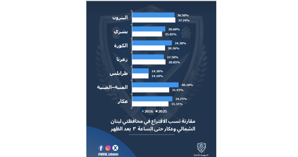 وزعت وزارة الداخلية نسب الاقتراع بحسب الاقضية في محافظتي الشمال وعكار  حتى الساعة وجاءت كالاتي:
