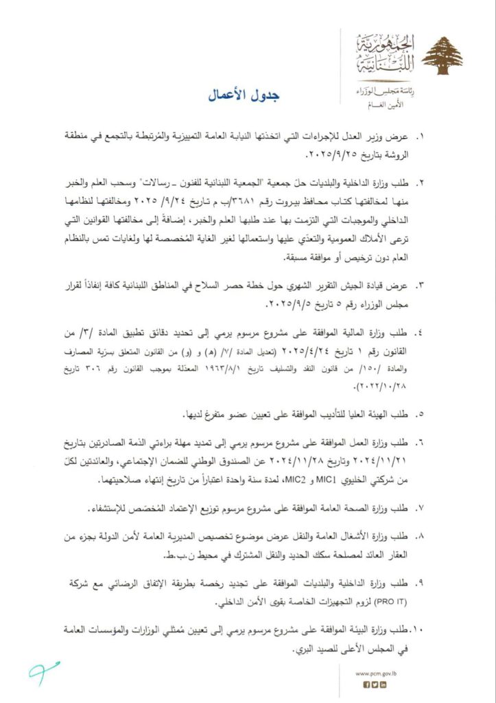 يعقد مجلس الوزراء جلسة بعد ظهر الاثنين في 6 تشرين الاول 2025 عند الساعة الثالثة في القصر الجمهوري، لبحث جدول أعمال يتضمن ملفات هامة.