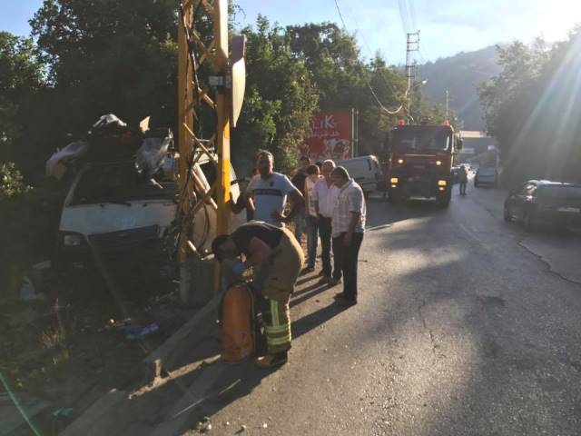عمل عناصر من الدفاع المدني بتاريخ ٢٩/٨/٢٠١٧ عند الساعة ٧:٠٠ على سحب مصاب من داخل سيارة مخصصة لنقل الخضار بواسطة معدات الانقاذ الهيدروليكية اثر اصطدامها بعمود للامداد بالطاقة الكهربائية.