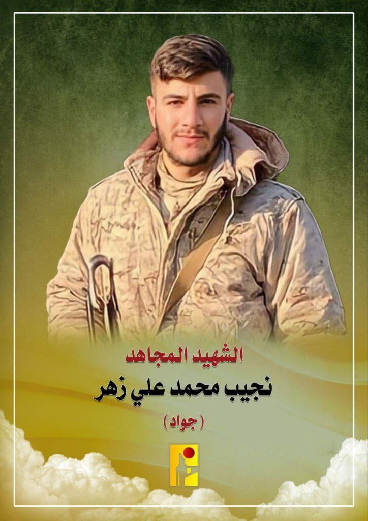 «بمزيد من الفخر والإعتزاز، تزف المقاومة الإسلامية الشهيد المجاهد نجيب محمد علي زهر «جواد» من بلدة بيت ياحون جنوب لبنان، والذي ارتقى أثناء قيامه بواجبه الجهادي».
