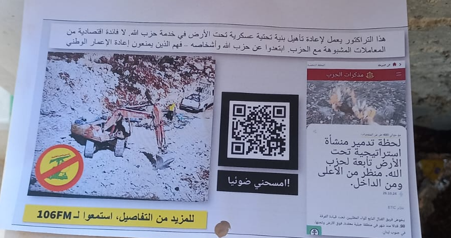 القت درون معادية مناشير في بلدة رب ثلاثين  تتضمّن اتهامات ل”حزب الله “بإعادة تأهيل بنى تحتية عسكرية تحت الأرض تحت غطاء أعمال حفر وبناء. ويحذّر المنشور المواطنين من التعاون مع هذه الأعمال.