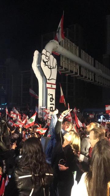 أفادت “الوكالة الوطنية للاعلام” أن المحتجين في جل الديب، أزاحوا الستارة عن مجسم لما يعرف بـ”قبضة الثورة” الذي رفعوه على المسلك الشرقي لأوتوستراد انطلياس، على وقع النشيد الوطني والأغاني الوطنية، في حضور عائلة ضحية حادثة خلدة علاء أبو فخر، الفنانة باسكال صقر، الممثلين وسام حنا ووجيه صقر، حشد من أهالي المتن ووفود من مناطق عدة، وسط انتشار للجيش والقوى الأمنية التي شكلت خطا فاصلا لتسهيل حركة السير.