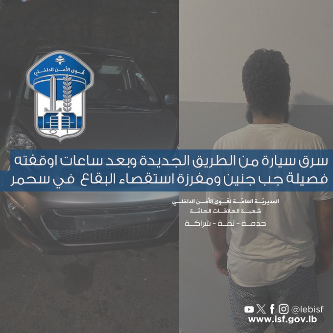 وبنتيجة المُتابعة، تبيّن أنّ السيّارة المسروقة موجودة في بلدة سحمر.