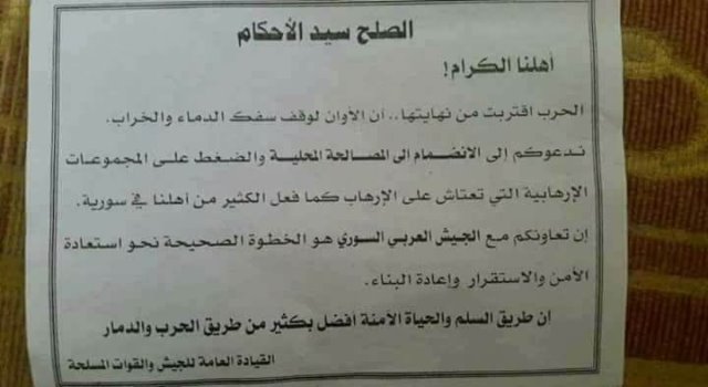 وخاطب الجيش السوري عبر هذه المنشورات الأهالي طالبا منهم الضغط على المسلحين من الجنسية السورية للدخول في مصالحات محلية تخلصهم من تحكم وأفعال الجماعات المسلحة وخاصة الأجنبية منها.