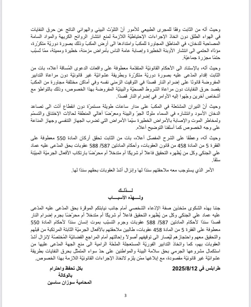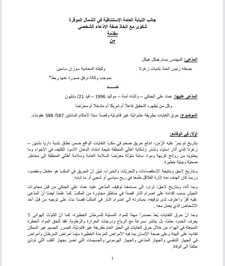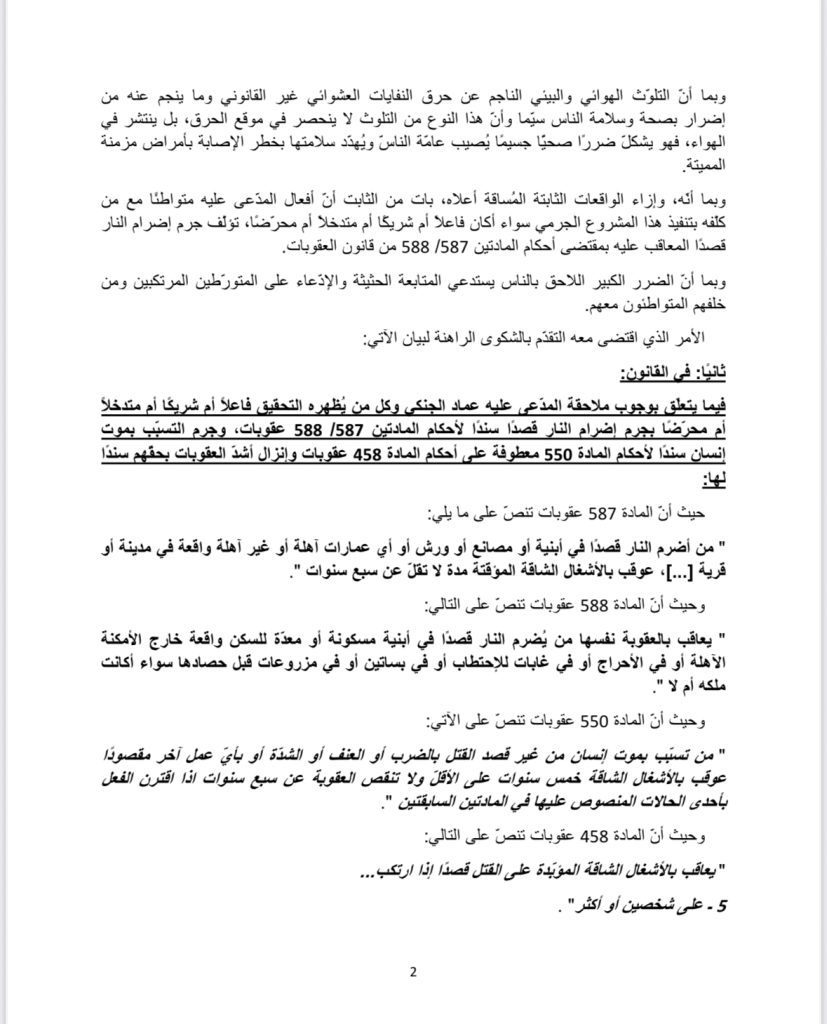 جننا بهذه الشكوى متخذين صفة الإدّعاء الشخصي أمام جانب نيابتكم الموقرة بحق المدّعى عليه المدّعى عليه عماد علي الجنكي وكل من يُظهره التحقيق فاعلا أم شريكًا أم متدخلا أم محرّضا بجرم إضرام النار قصدًا سندًا لأحكام المادتين 588 /587 عقوبات وجرم التسبّب بموت إنسان سندًا لأحكام المادة 550 معطوفة على الفقرة 5 من المادة 458 عقوبات، طالبين ملاحقتهم بالأفعال الجرميّة الثابتة المرتكبة من قبلهم والتحقيق معهم واحتجازهم ليُصار الى توقيفهم أصولا وإحالتهم أمام المراجع القضائيّة المُختصّة لإنزال أشدّ العقوبات بهم، كما واتخاذ التدابير الفوريّة المستعجلة الملحّة الرامية الى منع الجهة المدّعى عليها من استكمال مشروعها الجرمي بحق سلامة البيئة والمواطنين على حدّ سواء المتمثل بحرق النفايات بطريقة عشوائيّة غير قانونيّة مقصودة، مع إبلاغها ممّن يلزم لاتخاذ الإجراءات القانونيّة اللازمة بهذا الخصوص.