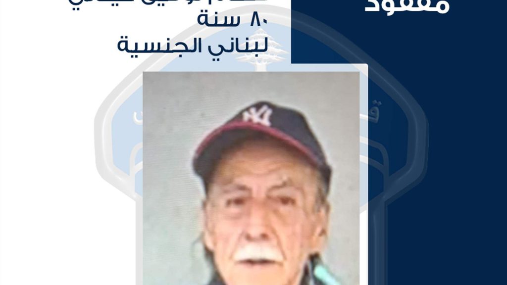 عممت المديريّة العامة لقوى الأمن الدّاخلي، بناءً على إشارة القضاء المختصّ، صورة المفقود:عصام توفيق عيتاني (مواليد عام 1945، لبناني) الذي غادر بتاريخ 8-8-2025، منزله الكائن في محلّة فردان – شارع كامل البابا، ولغاية تاريخه لم يعد، مع العلم أنّه يعاني حالة “ألزهايمر”.