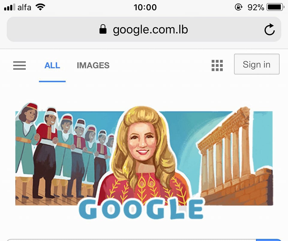 كرم غوغل اليوم الفنانة صباح في ذكرى عيد ميلادها التسعين، حيث تم نشر صورة السيدة صباح على صفحة البحث الرئيسية ووراءها على اليسار صورة لقلعة بعلبك وعلى اليمين صورة للدبكة اللبنانية.