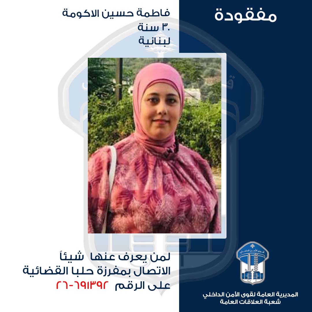 لذلك، يُرجى من الذين شاهدوها ولديهم أيّة معلومات عنها أو عن مكانها، الاتّصال بمفرزة حلبا القضائيّة في وحدة الشّرطة القضائيّة على الرّقم: 691392-26، للإدلاء بما لديهم من معلومات.