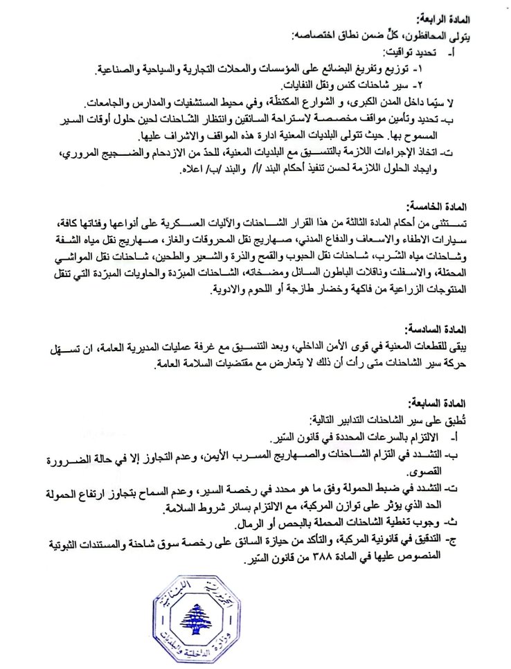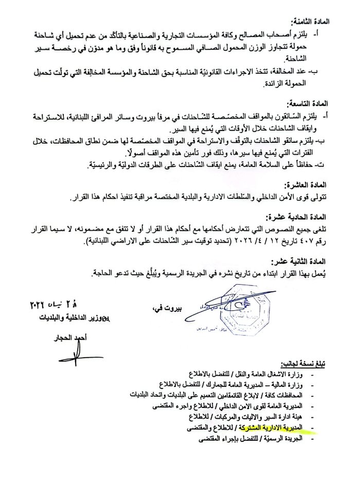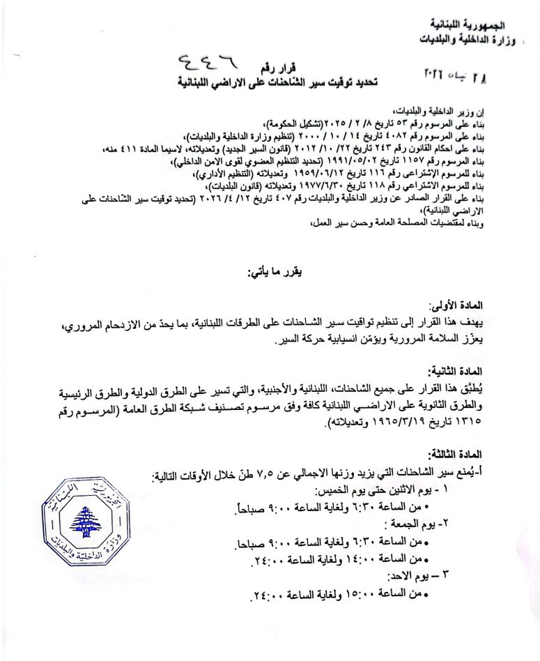 عممت وزارة الداخلية والبلديات القرار رقم 446 تاريخ 28/4/2026 حول تعديل توقيت سير الشاحنات على الأراضي اللبنانية.