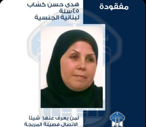 العلاقـات العامّـة البـلاغ التّالــي: “تُعمِّم المديريّة العامّة لقوى الأمن الدّاخلي، بناءً على إشارة القضاء المختص، صورة المفقودة: هدى حسن كساب (مواليد عام 1980، لبنانية) التي غادرت بتاريخ 12-08-2025 منزلها الزوجي الكائن في محلة حي السّلّم إلى جهةٍ مجهولة، ولم تَعُد لغاية تاريخه.