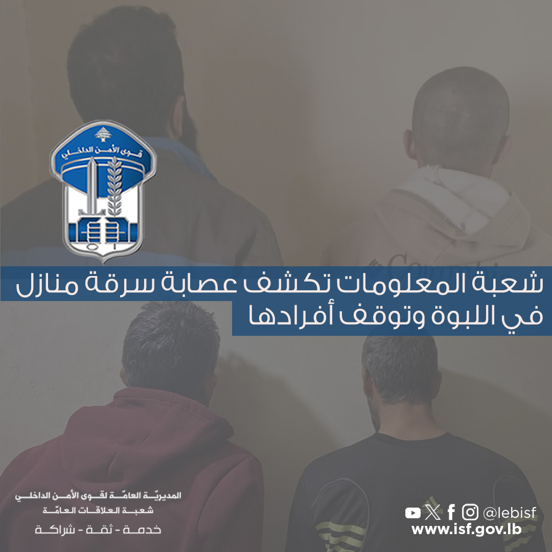 “في إطار المتابعة اليومية التي تقوم بها قوى الأمن الدّاخلي لمكافحة عمليات السرقة في مختلف المناطق اللبنانية، توافرت معطيات لشعبة المعلومات حول قيام مجهولين بتنفيذ عمليات سرقة من داخل المنازل، في بلدة اللبوة.