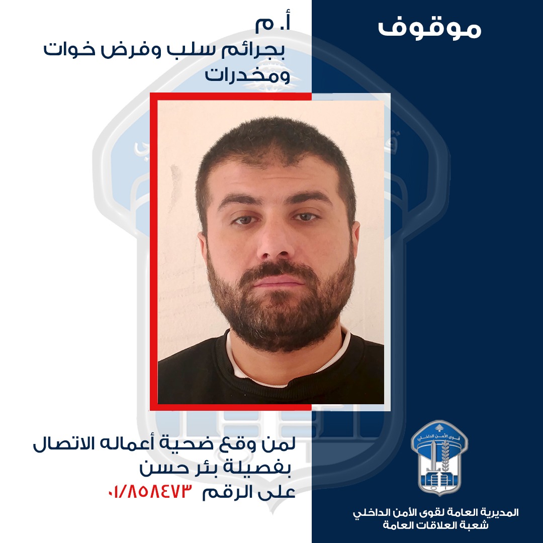 ‏لذلك، تُعمِّم المديريّة العامّة لقوى الأمن الدّاخلي، بناءً على إشارة القضاء صورة الموقوف، وتطلب مِمَّن وقع ضحيّته، الحضور إلى مركز فصيلة بئر حسن في وحدة الدرك الإقليمي، أو الاتّصال على الرّقم: 858473-01 تمهيدًا لاتّخاذ الإجراءات القانونيّة اللّازمة.