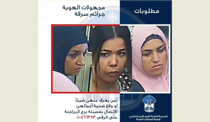 صـدر عـــن المديرية العامة لقــوى الأمــن الداخلي _ شعبة العلاقـات العامة البـلاغ التالي: “تعمم المديرية العامة لقوى الأمن الداخلي بناء على إشارة القضاء المختص، صورة /3/ مطلوبات للقضاء أقدمن بتاريخ سابق على سرقة محفظة إحدى المواطنات تحتوي على مبلغ مالي داخل محل لبيع المجوهرات في محلة عين السكة، وذلك من خلال استغلالهن للاكتظاظ في المحل. علما أنهن قمن بعدة سرقات مماثلة في المحلة المذكورة.
