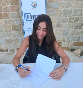 وقعت الكاتبة كريستا العم (16 عاما) ديوانها بعنوان “13 Scars of Dark Black M”، في مبنى الكبرى الأثري في إهدن، بدعوة من رعية إهدن زغرتا، في إطار المهرجان الثقافي الأول، بحضور حشد من المهتمين حيث يعود ريع الكتاب لدعم الاقساط المدرسية لعدد من الطلاب.