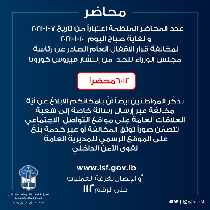 افادت المديرية العامة لقوى الامن الداخلي عبر حسابها على موقع تويتر ان 6012 هو مجموع محاضر مخالفات قرار التعبئة العامة المنظمة إعتباراً من تاريخ 7-1-2021 ولغاية صباح اليوم 10-1-2021 للحدّ من انتشار فيروس كورونا .