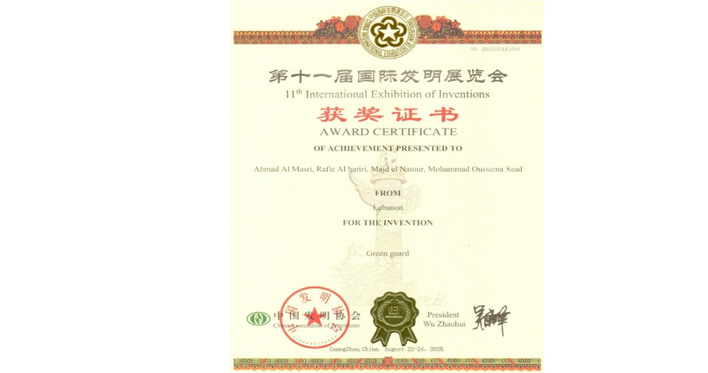لبنان يحصد الميدالية الذهبية في الصين بفضل ابتكار “Green Guard”