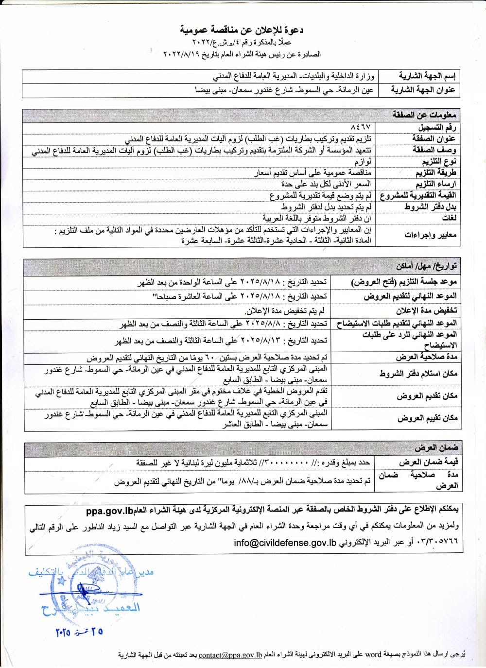 أعلنت المديرية العامة للدفاع المدني عن إطلاق مناقصة عمومية جديدة، ودعت المهتمين إلى الاطلاع على الشروط والمستندات المطلوبة والتقدّم بعروضهم ضمن المهلة المحددة، لغاية 18 آب 2025/8/18، في مركز الدفاع المدني الرئيسي – عين الرمانة.